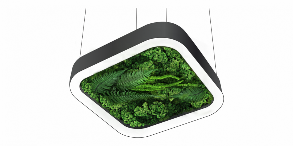 Светодиодный светильник в виде суперэллипса с натуральными стабилизированными растениями. Возможны различные варианты размеров, мощности и наполнения. Блок питания внутри корпуса светильника. Монтаж на тросовых подвесах или непосредственно к потолку или стене.