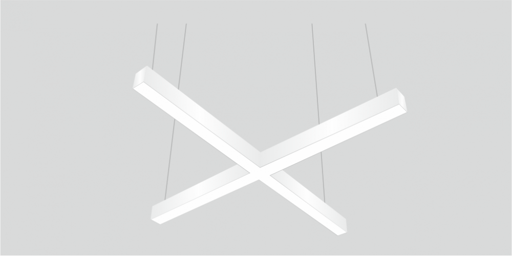 Светодиодный Лучевой светильник LiNE-Pro 4х500mm 40W 3000K белый предназначен для накладного или подвесного монтажа на тросовые подвесы. Изготовлен из сплошного сварного алюминиевого профиля в виде буквы «Х» (крестом). Высота установки светильника регулируется подвесом с цанговым тросовым зажимом и может варьироваться от 0,05 метра до 4 метров от основного потолка. Крестовой светильник имеет равномерную засветку по всей площади рассеивателя. Источник питания находится внутри корпуса. Торцевые заглушки входят в комплект. Возможно изготовление светильника с магистральной проводкой для соединения нескольких светильников в сплошную конструкцию.